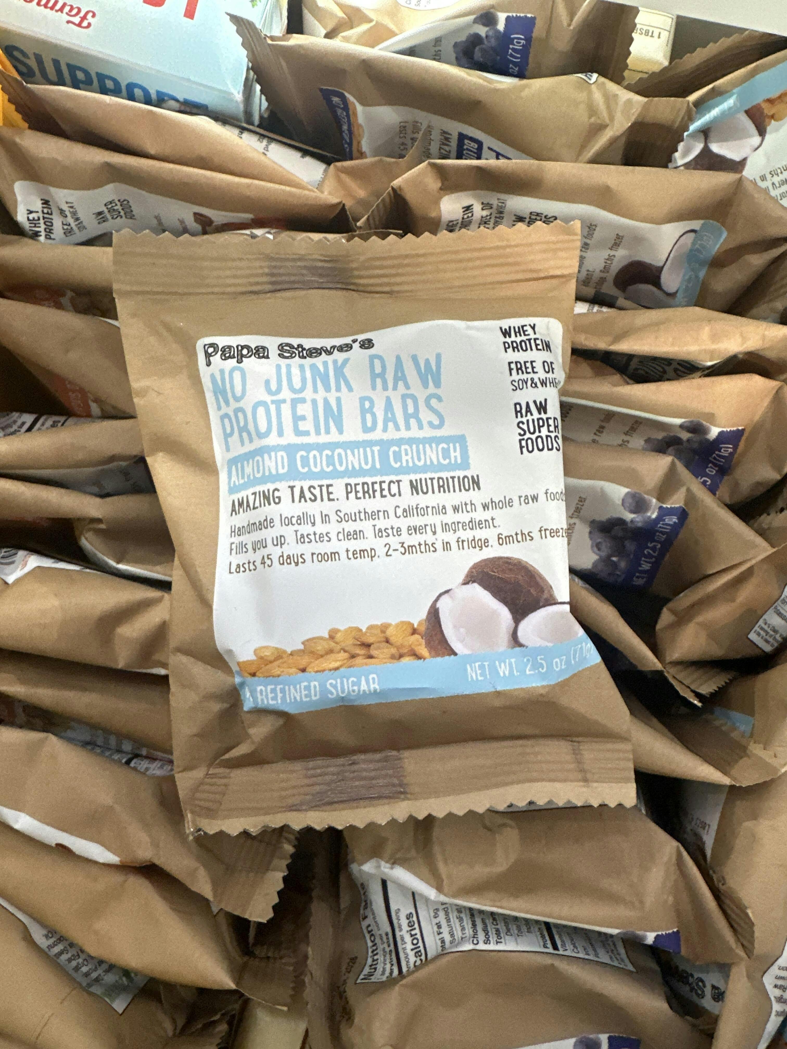 These are not like other bars that sit on the shelves for 8-10 months before you purchase them. Papa Steve’s NO JUNK Raw Protein Bars are made by hand every single week, which means they always contain fresh, raw ingredients.